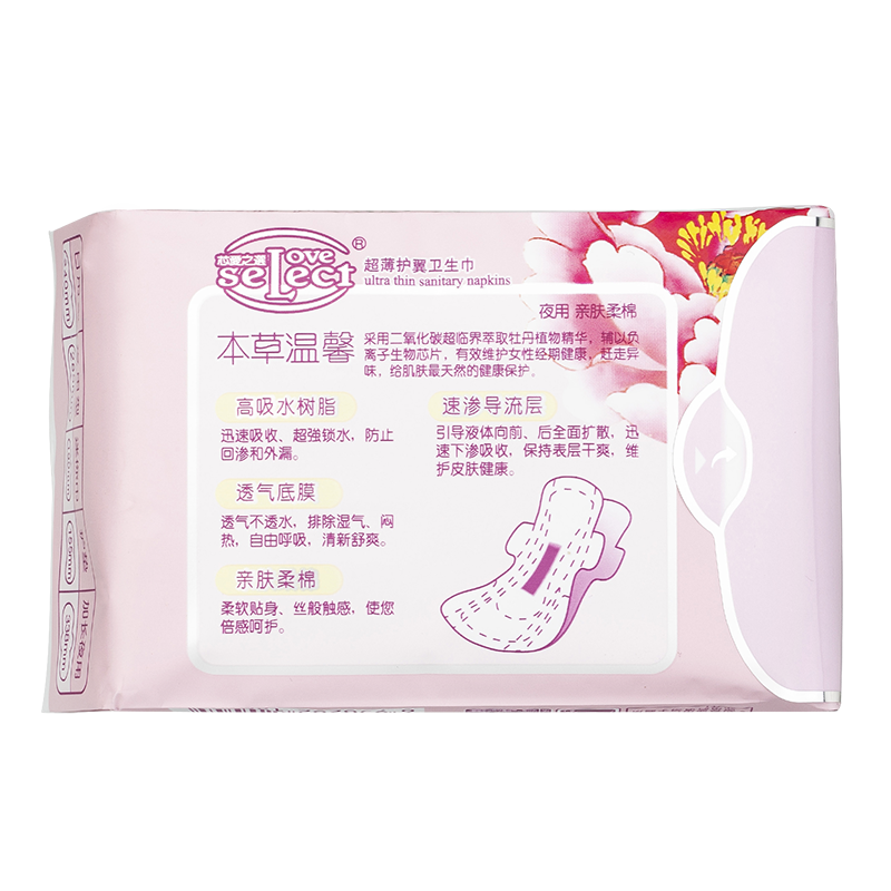 芯愛之選负离子卫生巾牡丹精华款采用二氧化碳超临界萃取牡丹植物精华,辅以负离子生物芯片,促进生物酶氧化,达到完美融合,清爽舒适,富贵芳香。